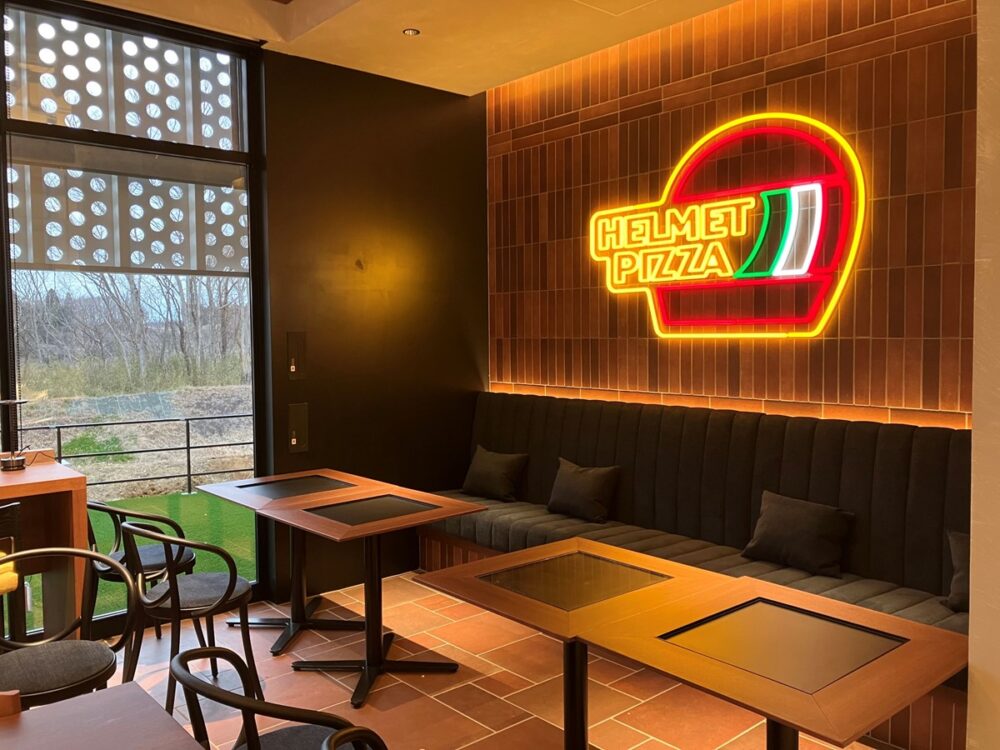「HELMET PIZZA」では、茨城県守谷市の人気店「IL NESSO pizza napoletana」の安藤シェフが監修プロデュースした、焼きたてナポリピッツアとイタリアンジェラートが楽しめる。SHOEI契約ライダーをイメージしたスペシャルコラボメニューも提供される。店内はイタリア製タイルを使用したウッディで落ち着いた雰囲気で、ヘルメットが展示されている。