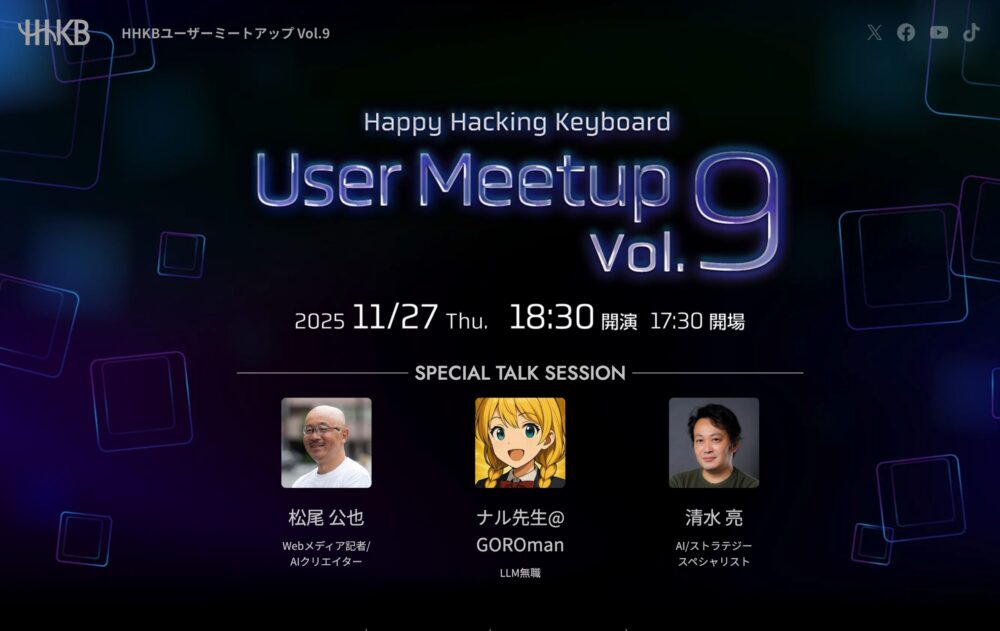 また、本日、HHKBユーザーミートアップVol.9の開催も告知された。こちら、いつもあっと言う間に席が埋るので、行きたい方はいますぐエントリーのこと。定員80人なので、おそらくすぐに埋ってしまうはず。