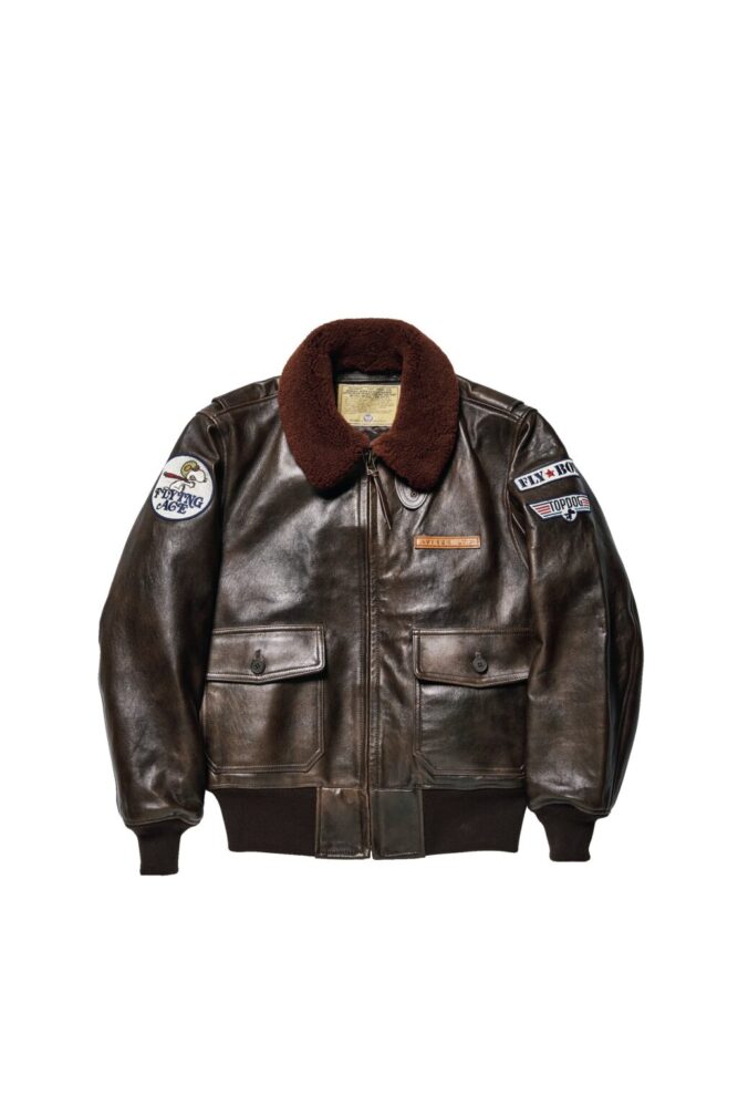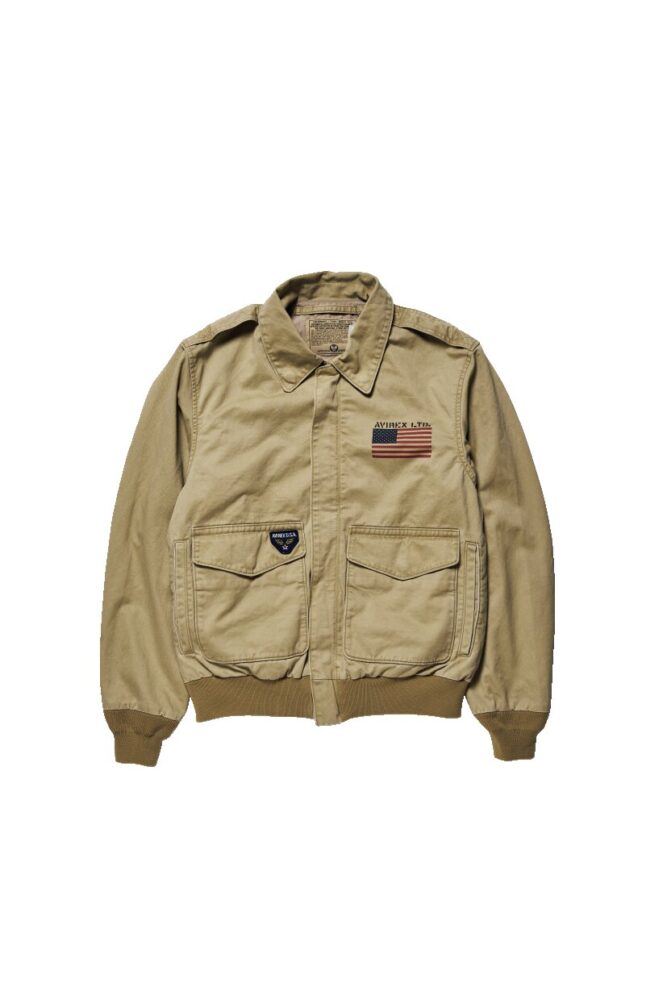 フライトジャケットの銘品、A-2をベースに丈夫なコットンツイルで製作。フロント左胸にはアヴィレックスのロゴと星条旗をプリントし、右ポケットフラップ部分にはブランドロゴのワッペン刺繍が付けられる。バックにはフライングエースのグラフィックが鎮座する。4万1800円