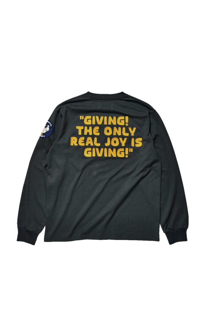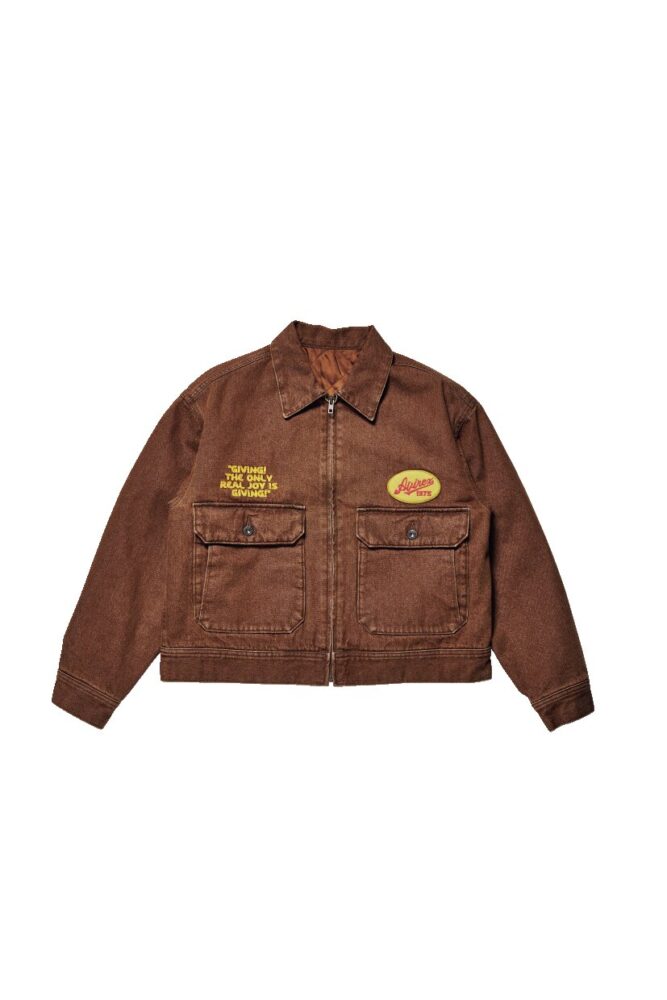 刺繍とワッペンによりカスタムされたシンプルながらも存在感のあるクラシカルなワークジャケット。左袖にはスヌーピーとチャーリー·ブラウンのワッペンが付けられ、背面には「GIVING! THE ONLY REAL JOY IS GIVING!」というメッセージが刺繍されている。3万5200円