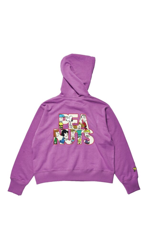 生地染め裏毛パーカをベースに背面にはピーナッツロゴのなかにキャラクターが載せられた大きなプリントがインパクト大。フリーサイズでゆったりと着られるのも良し。1万4080円