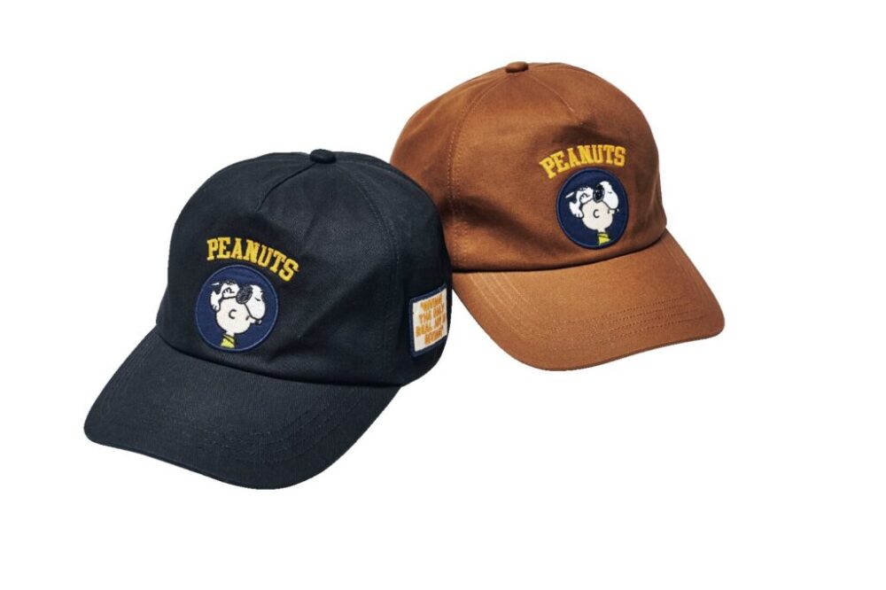 スヌーピーとチャーリー·ブラウン、のワッペンが付けられたシンプルなワークキャップ。バックにブランドロゴの刺繍がされる。9350円