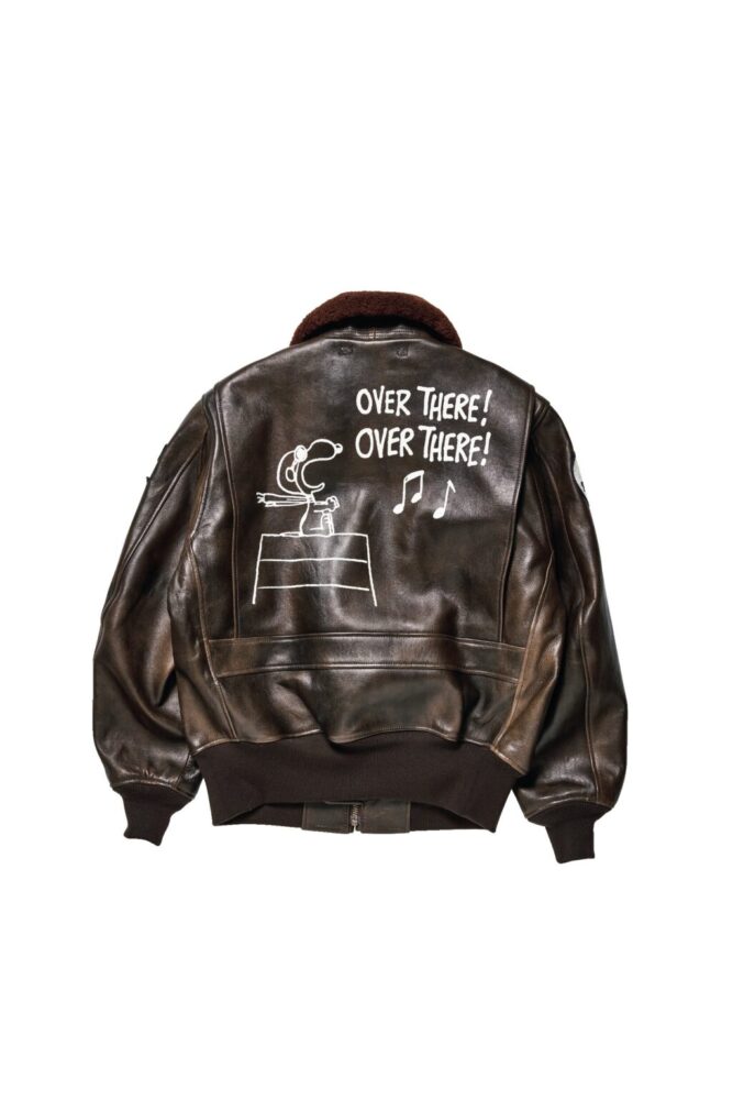 1990年代にアヴィレックスが使用していたアンティークラムをマテリアルに使用したG-1。ややゆったりめのボックスシルエットでムートン襟とハンドウォーマーポケットが付けられる。両袖にワッペン、背面には「OVER THERE」と歌うスヌーピーがプリントされる。14万3000円