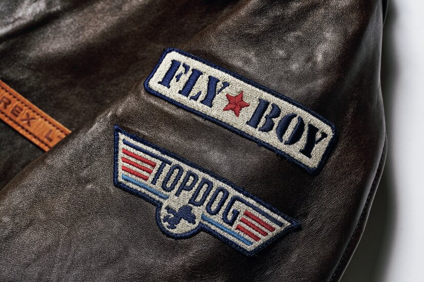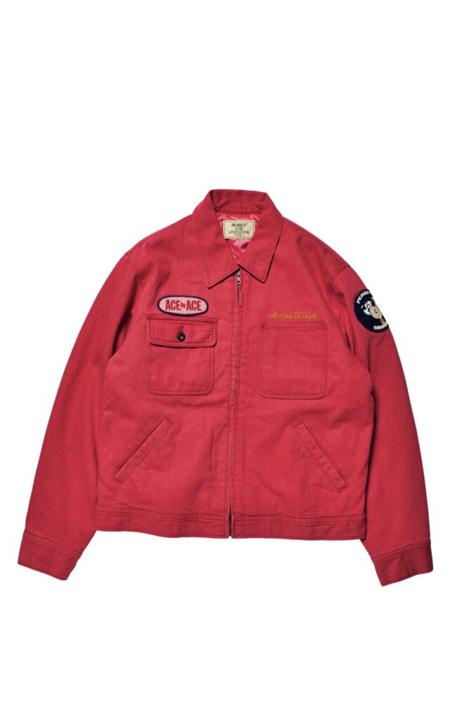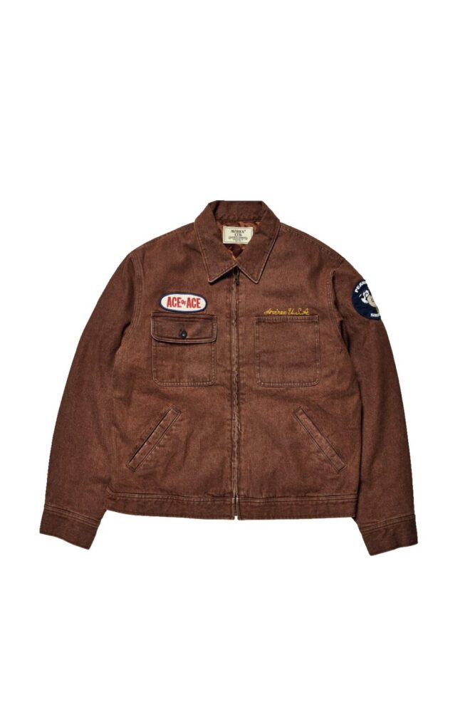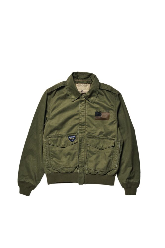 フライトジャケットの銘品、A-2をベースに丈夫なコットンツイルで製作。フロント左胸にはアヴィレックスのロゴと星条旗をプリントし、右ポケットフラップ部分にはブランドロゴのワッペン刺繍が付けられる。バックにはフライングエースのグラフィックが鎮座する。4万1800円