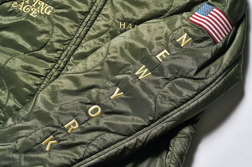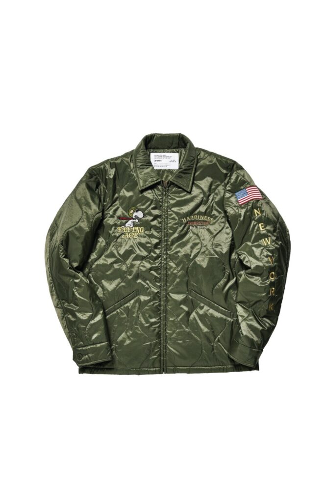 いわゆるベトジャンと呼ばれるキルティングジャケットをベースにしたミリタリーライクな1着。フロント右胸にはフライングエースのスヌーピー、左胸にはブランドロゴと「HAPPINESS」、左袖には星条旗がそれぞれ刺繍。バックにはグラフィックプリントが施される。3万800円