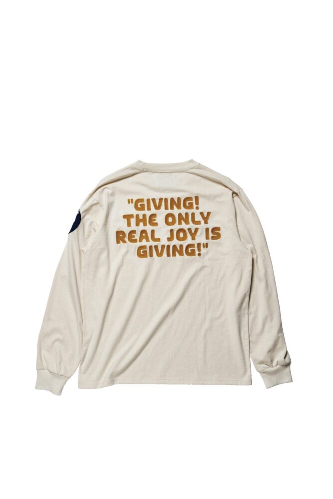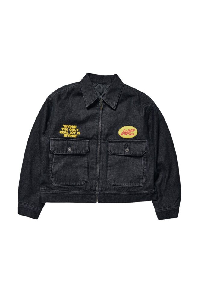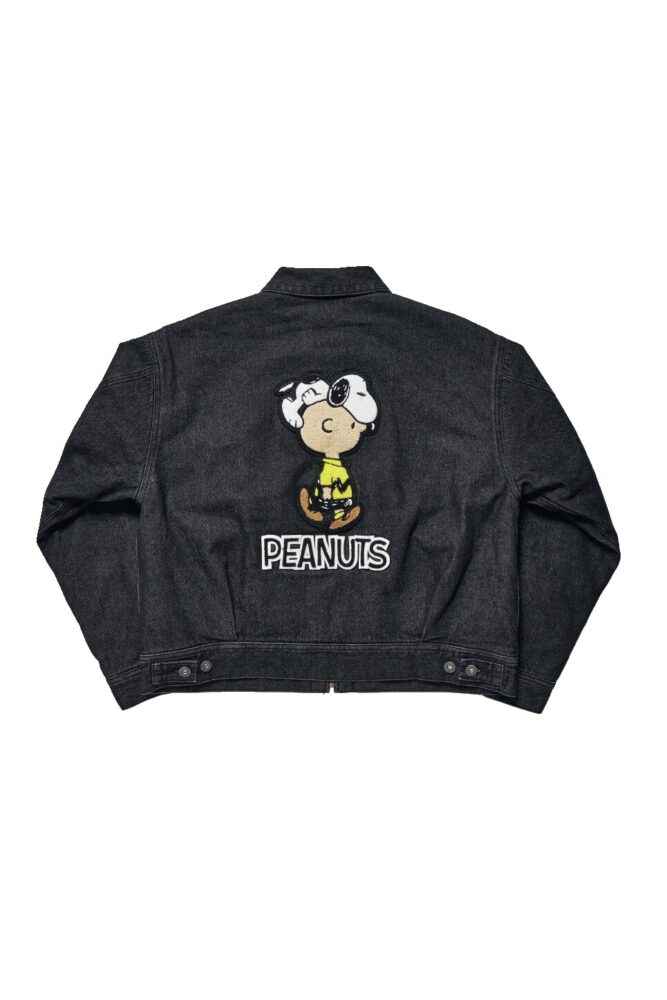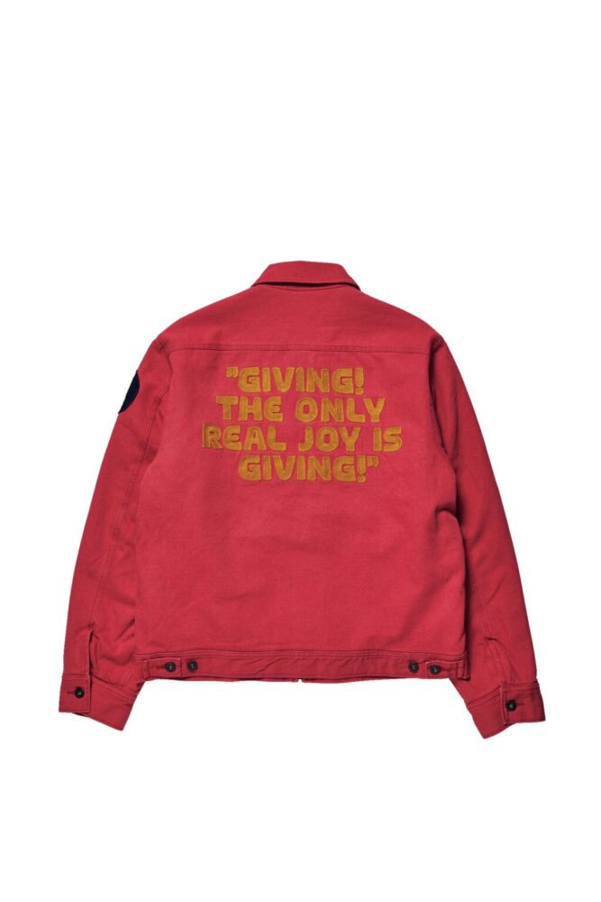 刺繍とワッペンによりカスタムされたシンプルながらも存在感のあるクラシカルなワークジャケット。左袖にはスヌーピーとチャーリー·ブラウンのワッペンが付けられ、背面には「GIVING! THE ONLY REAL JOY IS GIVING!」というメッセージが刺繍されている。3万5200円