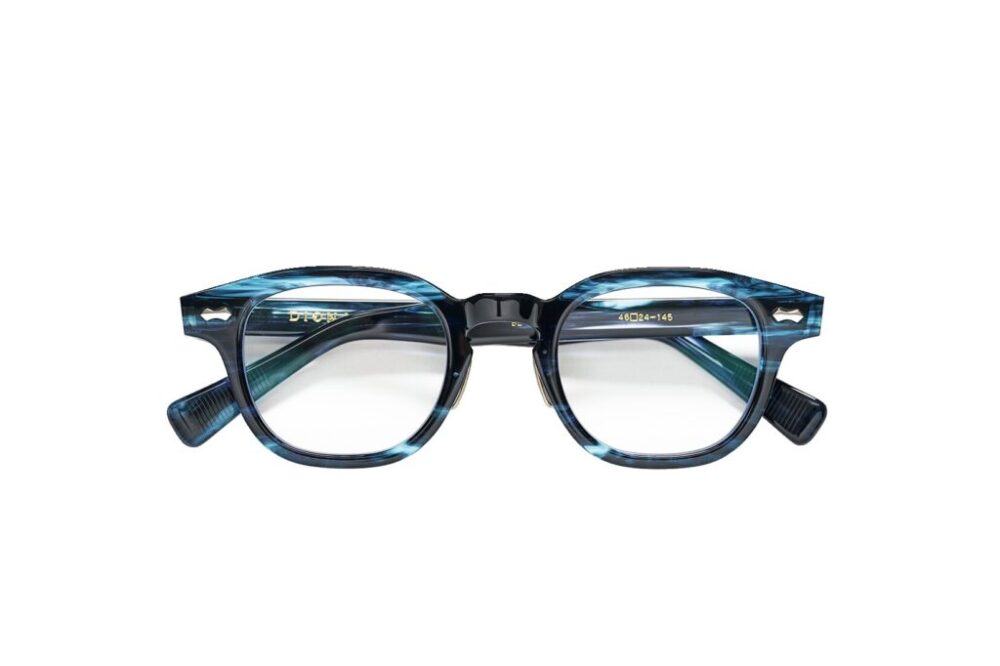 Jimmyのクリアブリッジモデルで、フレーム上部が濃色なので、よりカチッとした印象が強くなる。クリアレンズでもいいが、青系などのカラーレンズなら、程よいゆるさと上品さを両立できる。