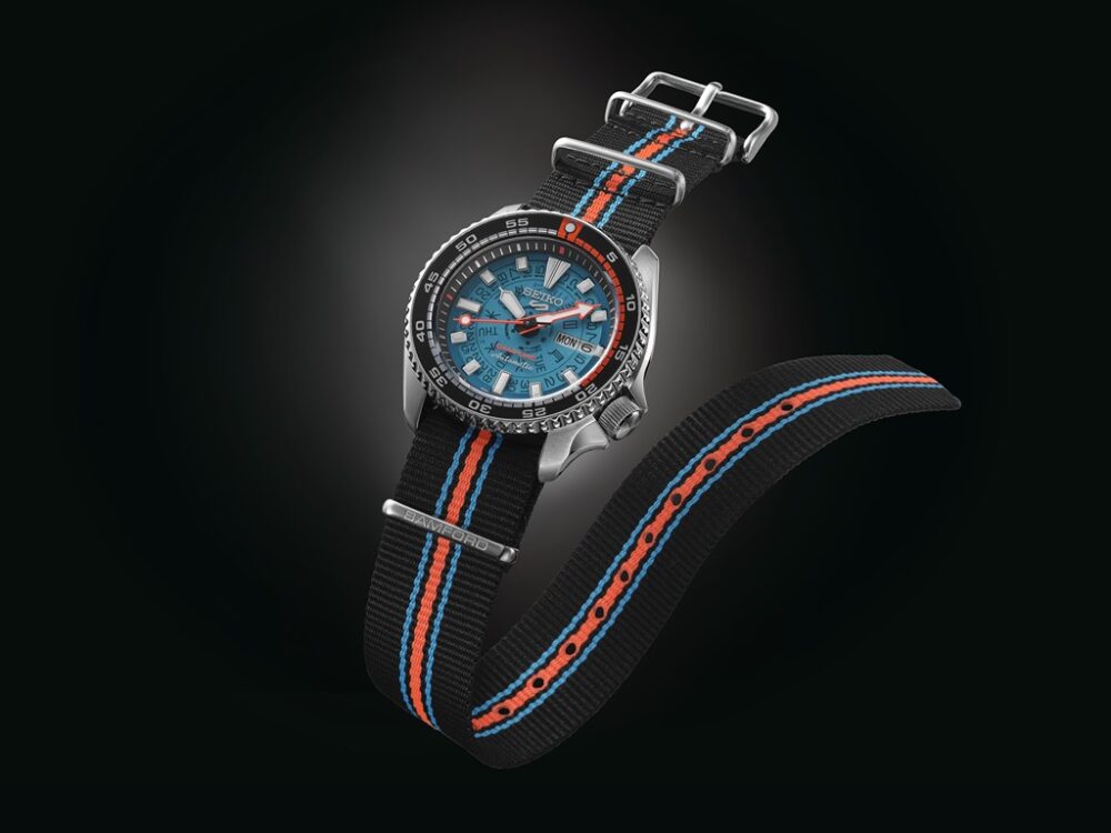 ベゼル表示板は、セイコー 5スポーツのアーカイブデザインを艶感ある素材で再現し、懐かしさと未来感を融合。ダイヤルの6時位置とナイロンストラップの留具には“BAMFORD”ロゴがさりげなくレイアウトされている。