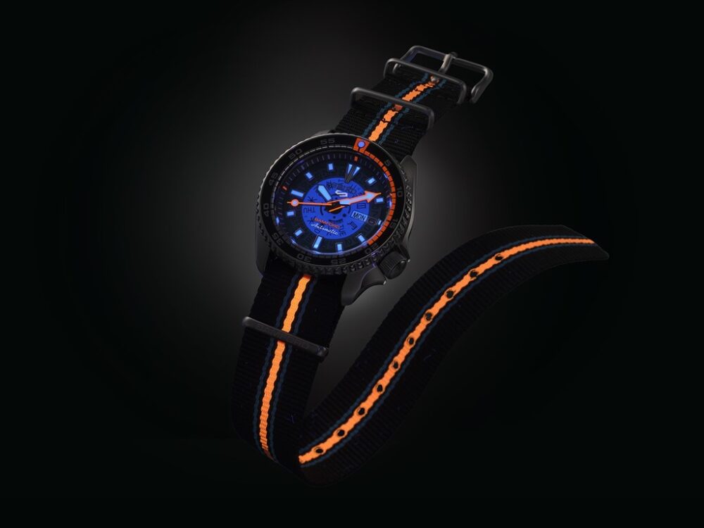 ダイヤルのインデックス、針、ベゼル表示板の12時位置にはルミブライトが施されている。ベゼル、針、ナイロンストラップなどモデル全体にあしらわれたネオンオレンジを採用したことで、ブラックライトの下では幻想的に光を放つ表情を楽しむことができる。