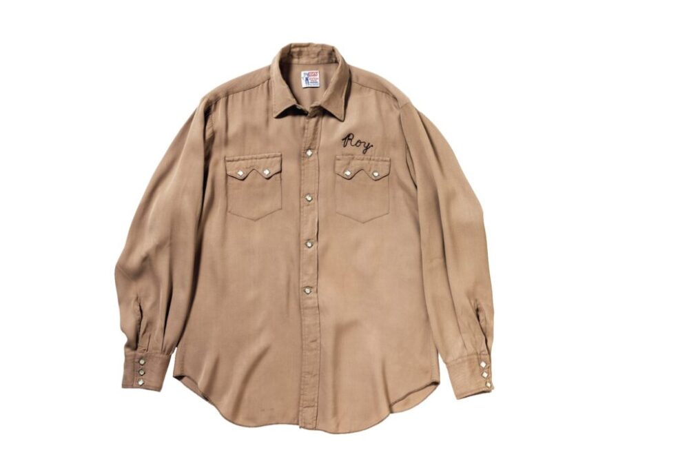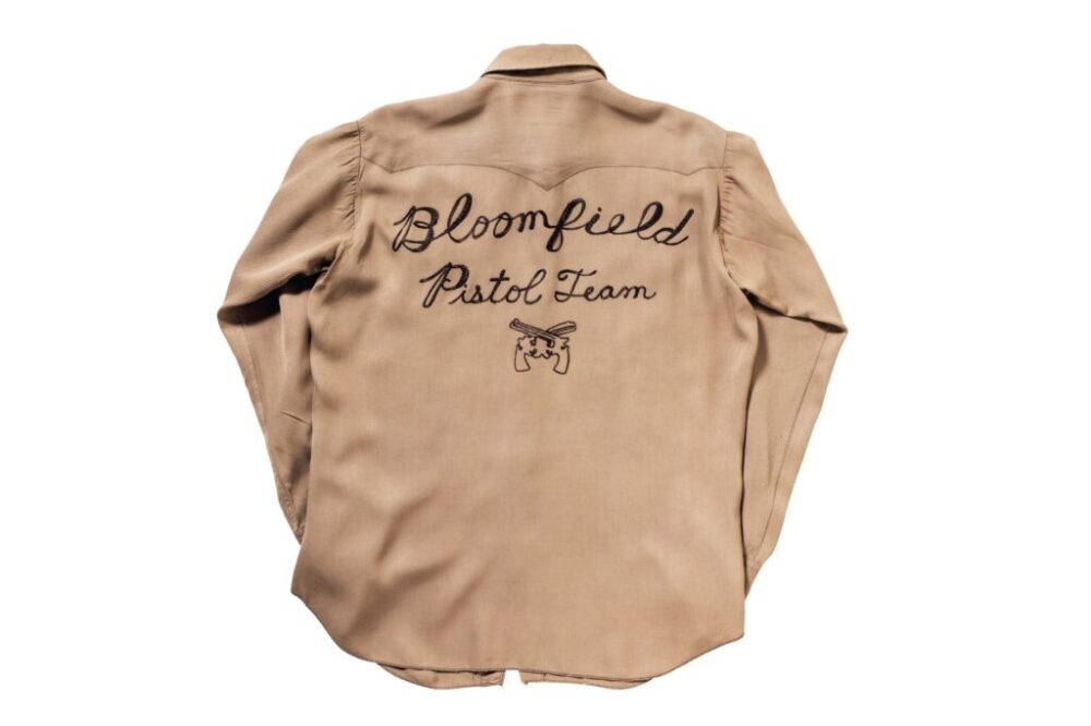 レーヨンギャバジンを用いたグッドデザインのウエスタンシャツ。背面には所有者が所属していたカウボーイの本場コロラド州のピストルチームのチェーン刺繍が施されている。