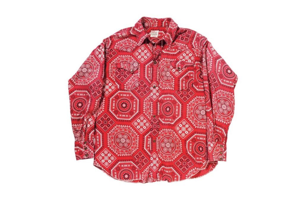 寺本さんらしいスペシャルなウエスタンシャツ。後期のショートホーンタグで、バンダナ柄を大胆に使った仕様。銅のスナップボタンも注目。