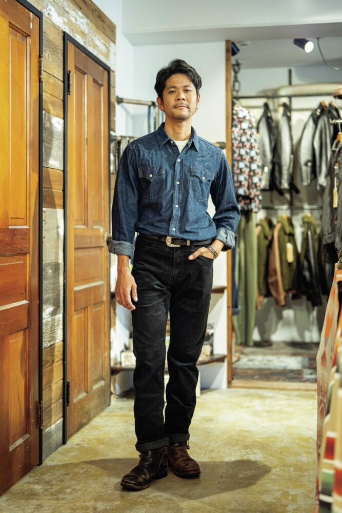 「今のスタイルであれば太めのパンツを合わせるのが正解かもしれませんが、トレンドに左右されない普遍的な男らしさも提案したくてこのパンツを選びました。デニムとコーデュロイという生地の違いも楽しめますし、ベルトがアクセントになってくれます。それとエンジニアブーツはシャフトが細くスマートなので、武骨さの中に上品さも感じられるかなと。気負わずにウエスタンを楽しんでほしいですね」