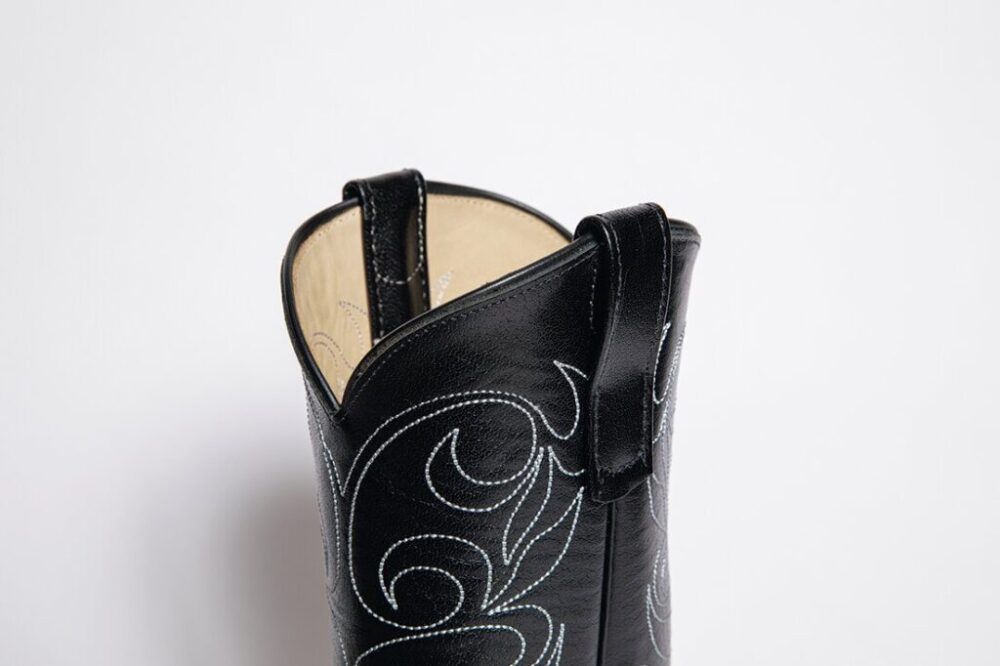 シャフトの上部(履き口)に配置されるループ。ウエスタンブーツはシャフトが長いものが多く、履きにくいのが難点だ。このループは履く時にブーツを引き上げるためのもので、これがあるだけで一気に履きやすくなる。