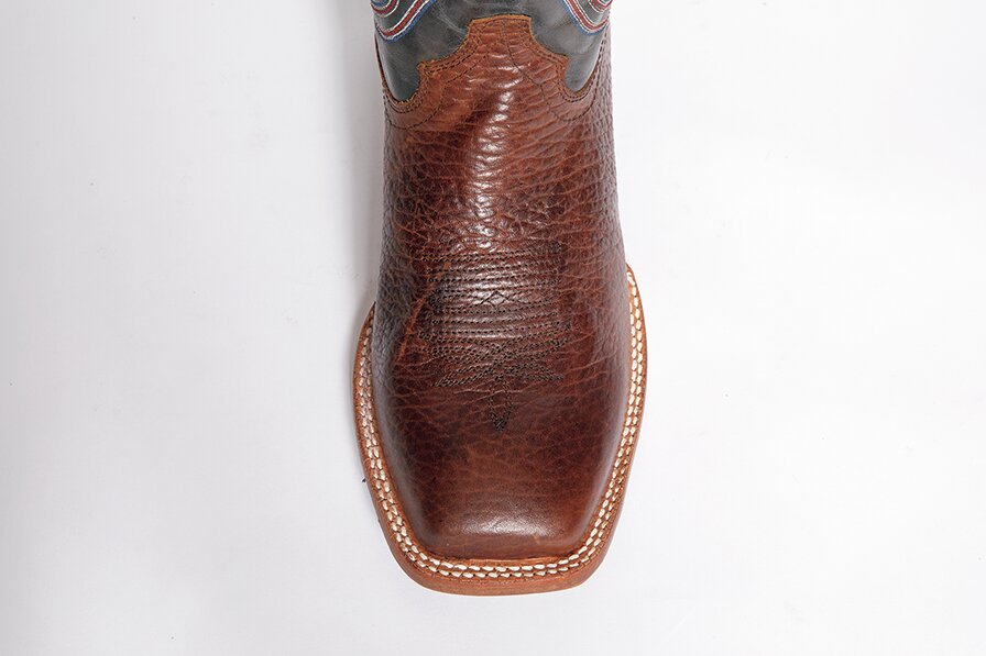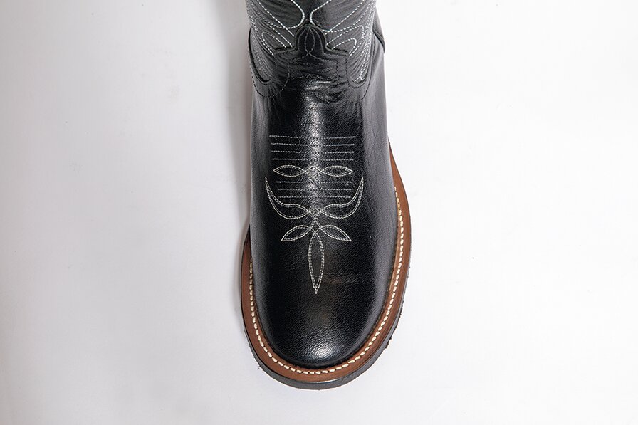 最もウエスタンブーツらしいトゥの形状。先端がやや尖った形状となっており、スタイリッシュな印象。これは乗馬の際に鞍に足を入れやすくするための機能的なディテールだ。