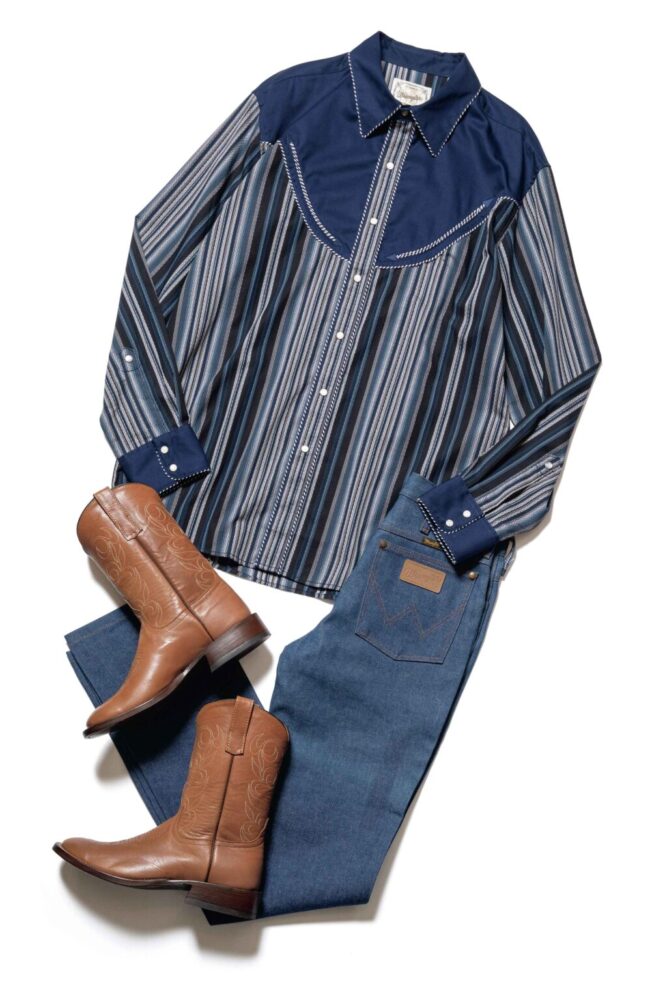 ウエスタンシャツとジーンズという王道の組み合わせ。ポケットのデザインやヨークなど、まさに“ウエスタン”なシャツは、アメリカ企画の「ラングラー」。ジーンズはブーツカットでももちろん良いが、ストレートでもなんら問題はない。映画『タクシードライバー』のロバート・デニーロもストレートのデニムにウエスタンブーツを合わせていた。トップスとパンツが落ち着いたカラーであるため、ブーツはブラウンがベターだ。