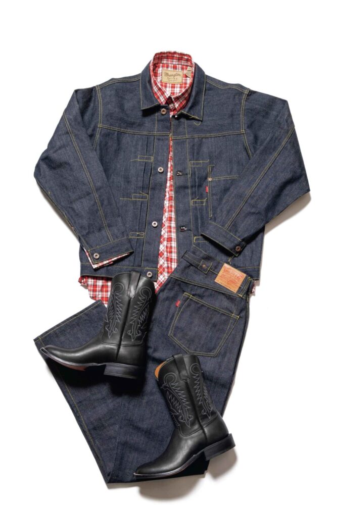 デニムのセットアップにブーツは、アメリカンカジュアルの王道中の王道。なかでも足元にエンジニアブーツを合わせるのが一般的だろう。そこで、足元をウエスタンブーツに変えるだけで一気に新鮮なスタイリングへと変貌する。特に、ポインテッドトゥを選ぶことで、やや野暮ったく感じられるワークスタイルがスタイリッシュに仕上がる。デニムジャケットの中にはチェックのウエスタンシャツを着用している。
