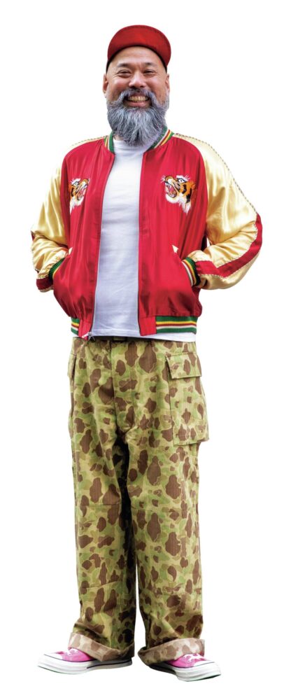 インパクトが強く、着こなしが難しく感じられるスカジャン。カルロス西さんがまず気をつけているのはシルエットだ。「丈の短いスカジャンに合わせ、太めのパンツでAラインを作ることが多いです」とダックハンターカモのトラウザーズを選択。
