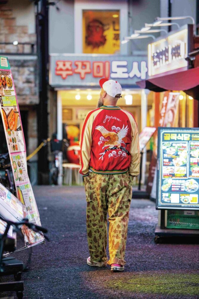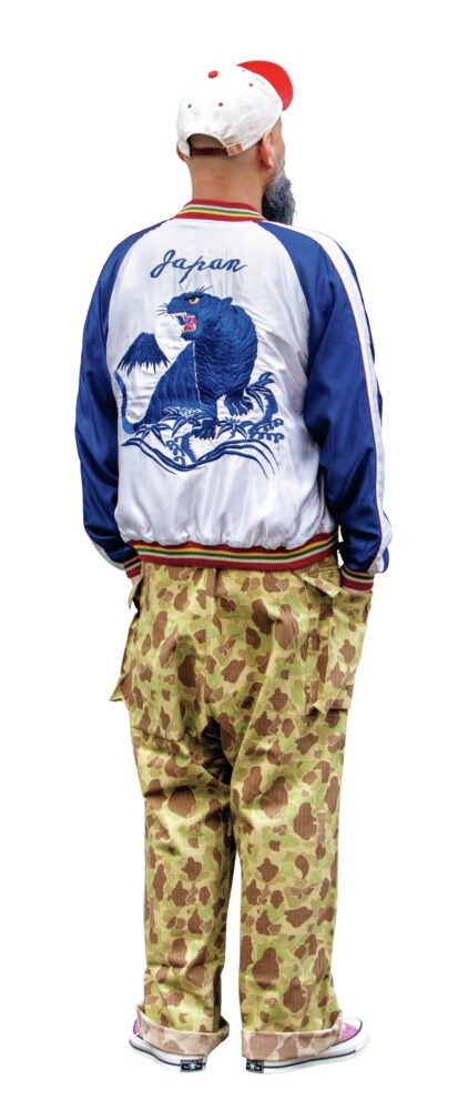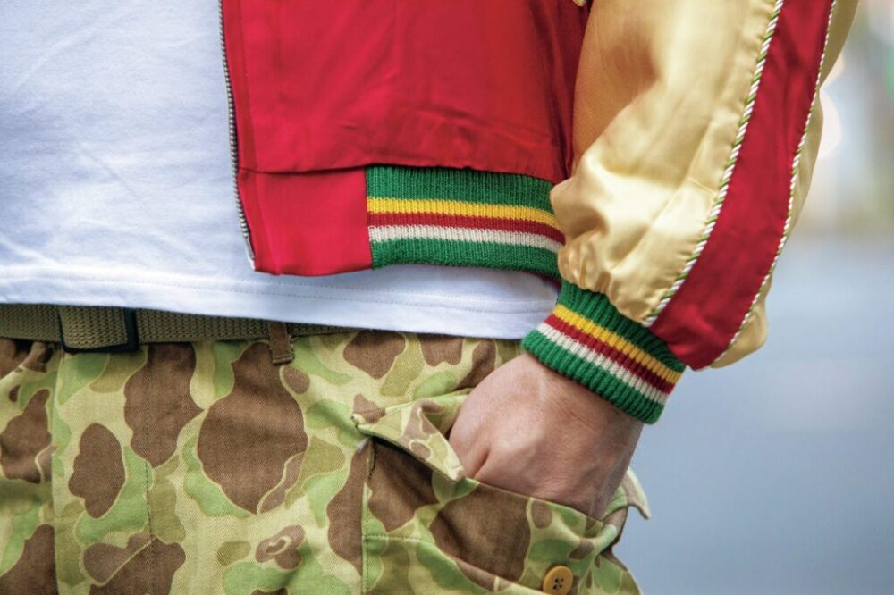 インパクトが強く、着こなしが難しく感じられるスカジャン。カルロス西さんがまず気をつけているのはシルエットだ。「丈の短いスカジャンに合わせ、太めのパンツでAラインを作ることが多いです」とダックハンターカモのトラウザーズを選択。