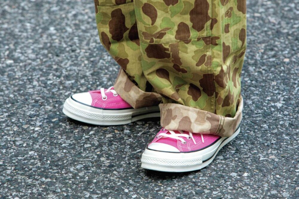 キャップと同様、スカジャン特有の武骨な雰囲気を和らげるのにひと役買っているのがキャッチーなスニーカー。ダックハンターカモのパンツにピンクが意外と合うということに気づいた方も多いのでは?