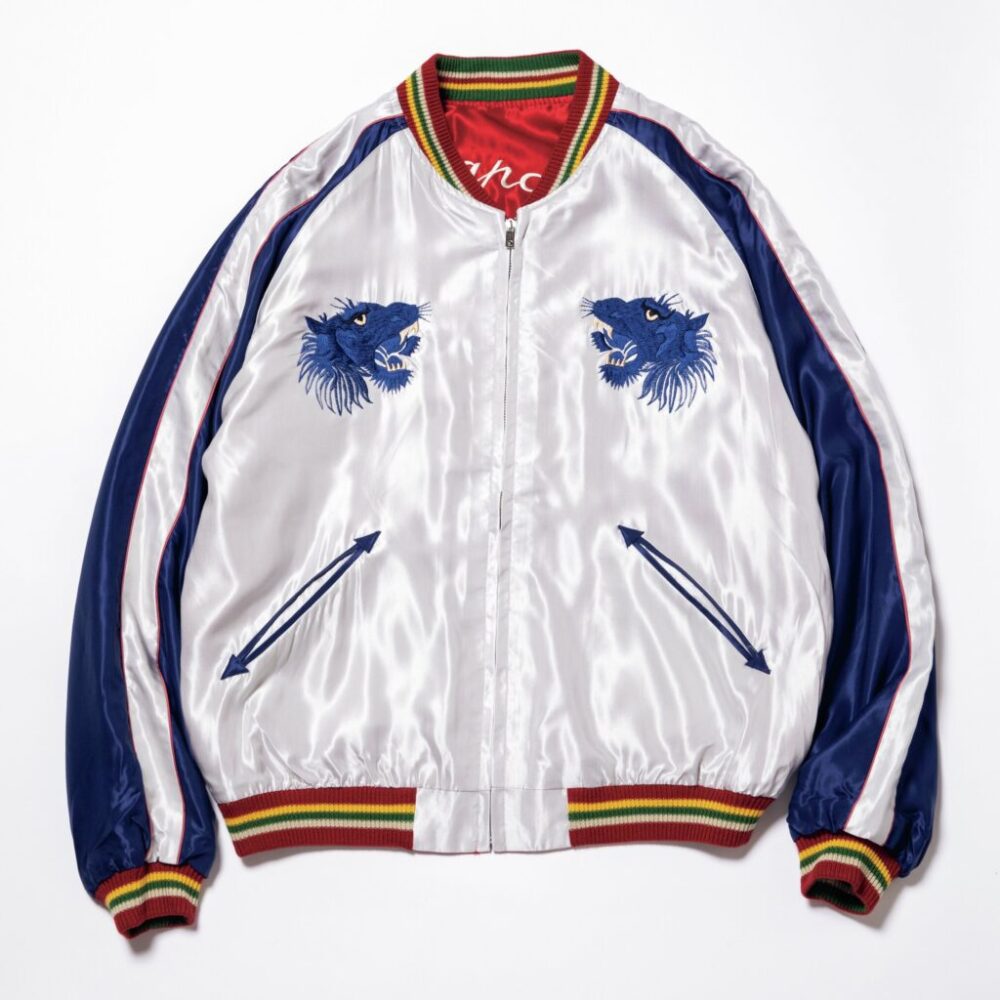 ワインカラーとは“逆配色”ともいえるシルバー×ネイビーのリバーシブル面。咆哮するブルータイガーの毛並みや縞模様を横振り刺繍の立体感と陰影によって巧みに表現している。配色が爽やかなため、全体としてクリーンな印象にまとまる。1着で2度おいしい、まさしく両A面な1着だ。