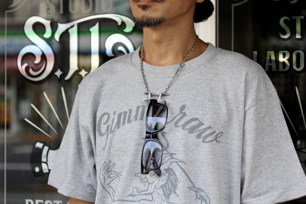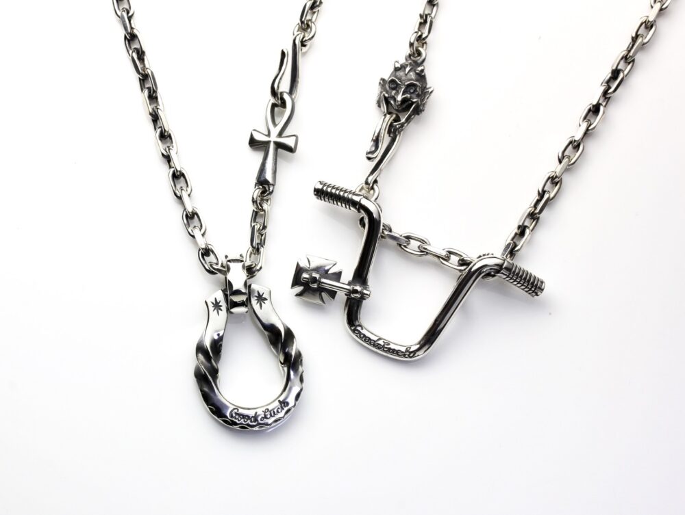 シルバー925を使用した、グラスホルダーペンダントをピックアップ。ともに「GoodLuck」の文字が刻まれている。「エイプハンガー」のミラー裏には、「Don’t Look Back」の刻印。 こだわりのディテールが持つ人の心をくすぐる逸品。