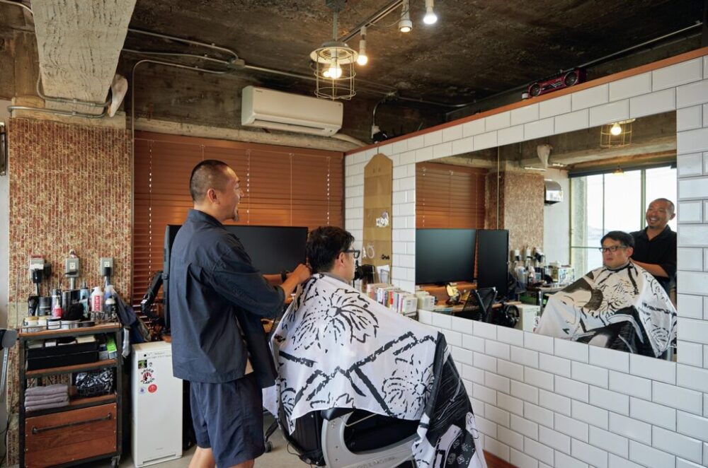 それだけで十分ユニークだが、ココの面白さはもう一つある。散髪時に服に毛がつかないよう客が着用するカッティングケープ。中村さんは『中村商店』の名で、そのケープに和柄や幾何学模様などのプリントを施して製造販売。国内外のバーバーからもリスペクトされるプロユースのブランドを展開しているのだ。