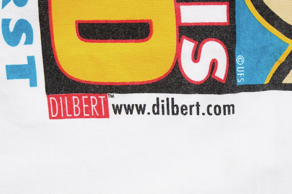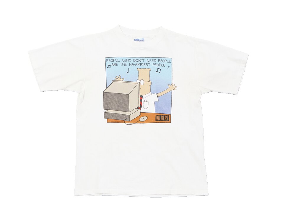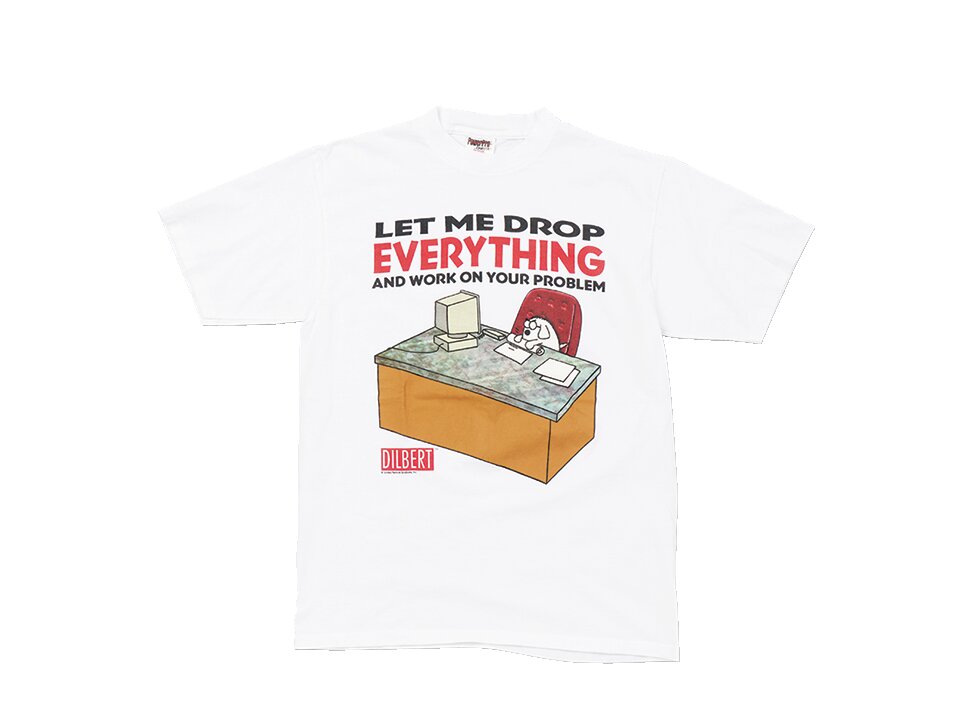 1989年から新聞掲載されたコマ割り漫画。作者「スコット・アダムス」によるディルバートというエンジニアを主人公にした企業が舞台の職場文化を風刺した作品。Tシャツでは1コマと文字で表現されている。気の抜けたタッチと明るい色使いを裏腹に鋭いところを突いてくる目線と考え方が光る。デザインだけで選びがちなTシャツだがコチラは漫画の内容も込みで選ぶと良いだろう。