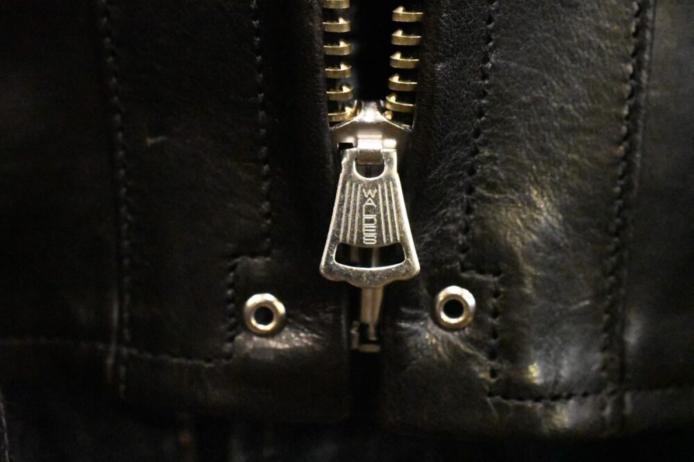 フロントファスナーはWALDESの扇形ピンロックファスナーを採用。ファスナーの金具とレザーをハトメで固定する構造は20’s~30’sならではのディテールだ。