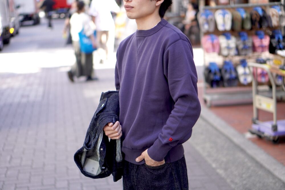 スタッフとお客様の声から生まれたこのスウェットは、国産ならではの丁寧な縫製と堅牢なつくりが魅力。希少な低速台丸機で編み立てられる生地は、1日にわずか20枚。フラットシーマーによる4本針縫製で縫い上げられ、丸胴ボディや両Vガゼットなどヴィンテージディテールも抜かりない。柔らかすぎないハリ感は、着込むほどに自分の体へと馴染み、まるでデニムのように経年を楽しめる“育てるスウェット”だ。1万6500円/ヒノヤ(ヒノヤ ワンTEL03-3831-0385)