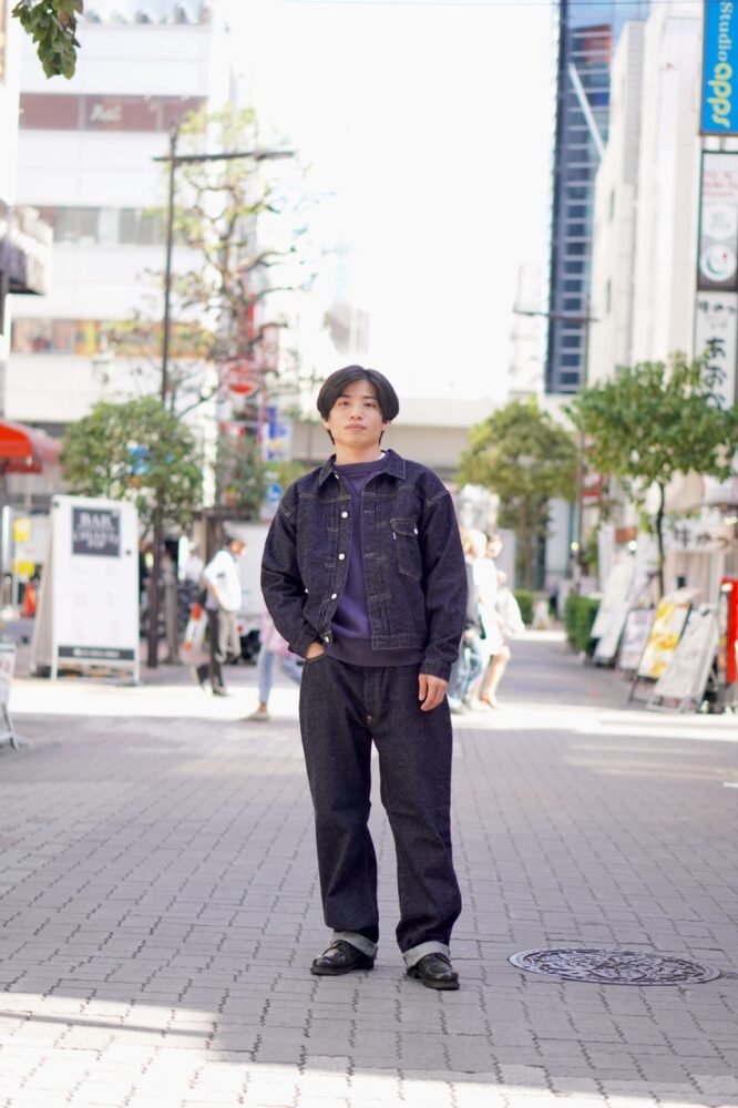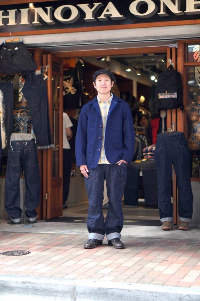 「インディゴ染めの素材違いで遊んだスタイリングです。ジャケットの刺し子とデニムパンツの同色異素材のコントラストを楽しみつつ、ネルシャツでほどよいカジュアル感をプラスしました。明るいカラーのネルシャツを差し色として取り入れることで、全体の印象に深みを加えました。靴と帽子は黒で統一し、全体をすっきりとまとめています。素材や色のわずかな違いを楽しむ、遊び心のあるスタイリングです。」