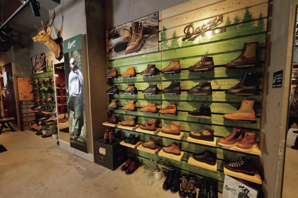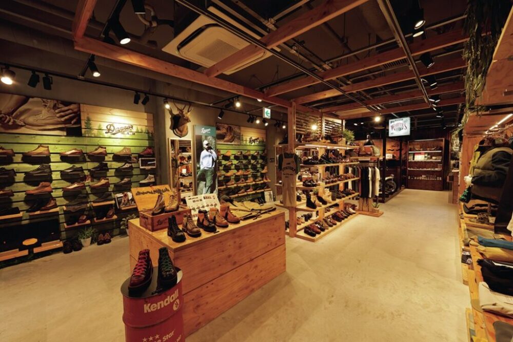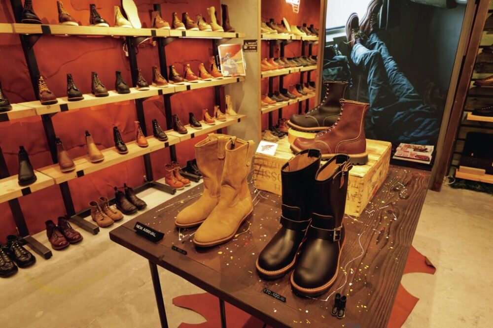 奥行きのある店内。手前からレッドウィング、中央にはダナー、そして奥にはホワイツブーツのコーナーがセクション分けされている。