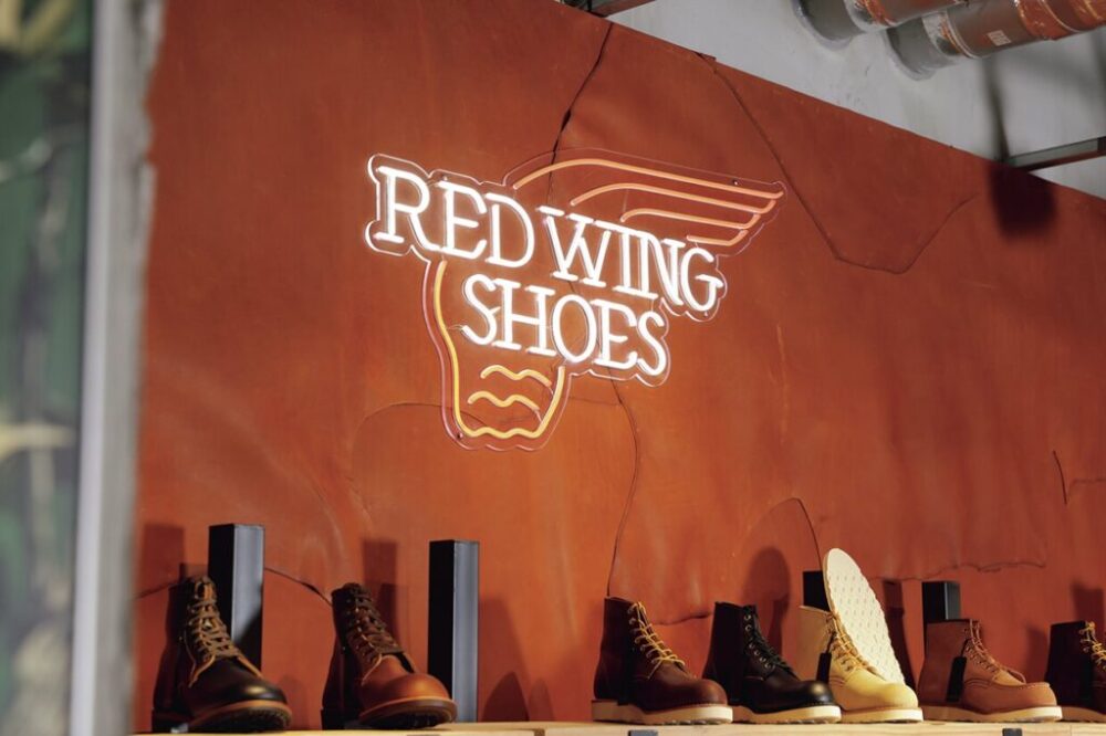 レッドウィングが並べられるコーナーの壁面にはブランドを象徴するレザーでもあるオロ・レガシーが敷き詰められる。