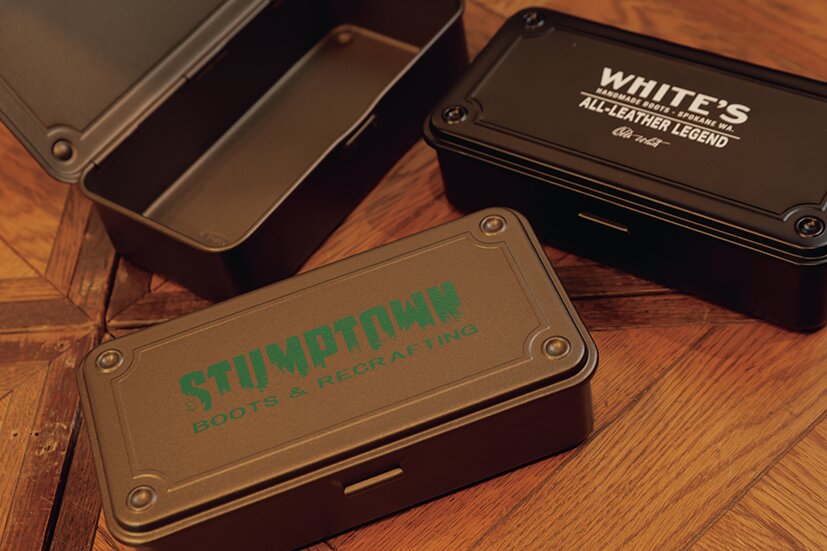 オープン記念のノベルティとして作られた東洋スチール社製の小型トランク工具箱もワークブーツ専門店らしさ全開。