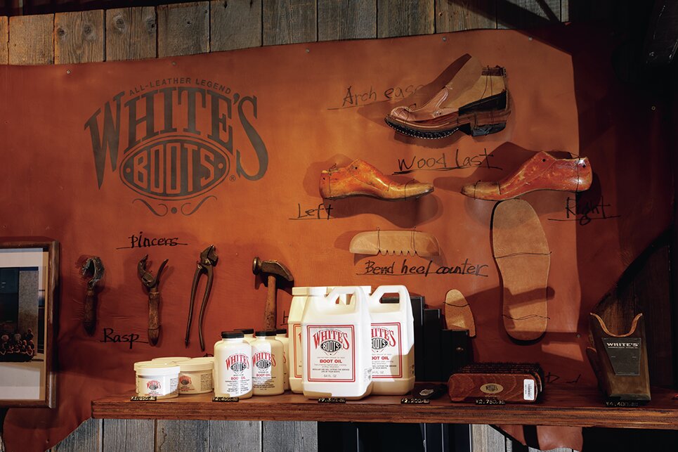 ハンドソーンウェルテッド製法に使用されるホワイツの道具が飾られ、オイルなどのメインテナンスキットも販売される。