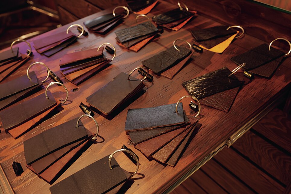 ホワイツブーツのカスタムオーダーが正規で受けられるのは仙台店が東北初。好みの革を選ぶのも愉しみのひとつ。