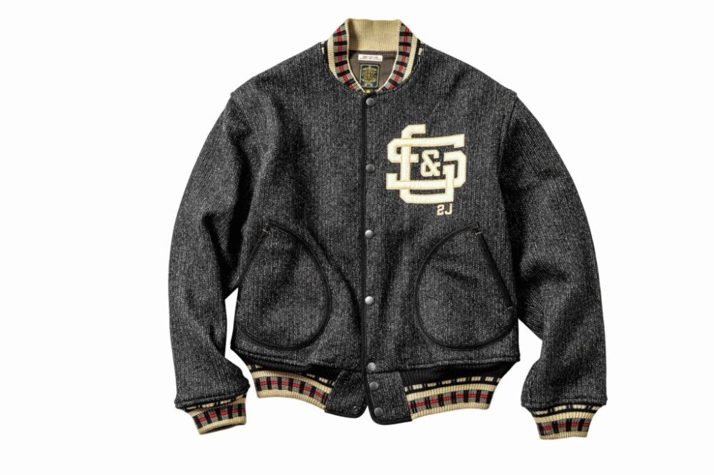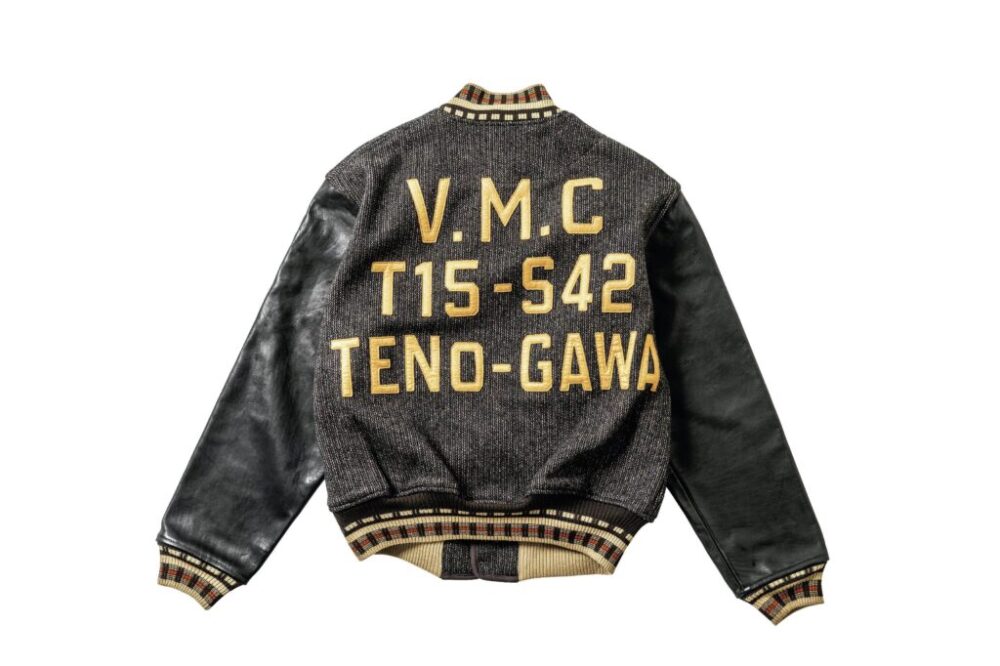 上のGS2529905をベースに、袖を馬革のツートーン仕様にしたバーシティジャケット。さらに背面にもウールのアップリケを刺繍することによって、より武骨な雰囲気に。大正15年から昭和42年まで開催された天王川オートレースがモチーフ。¥83,600