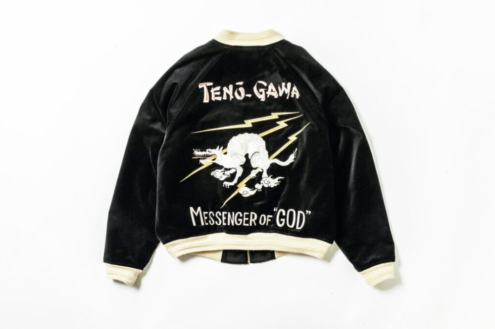 「天王川オートレース」へのオマージュを込めたスカジャン。“神の使い”とも称される白狼を随所にあしらったオリジナル品で、50年代製別珍スカジャン特有の拙い雰囲気がありながらインパクトは健在。¥53,900