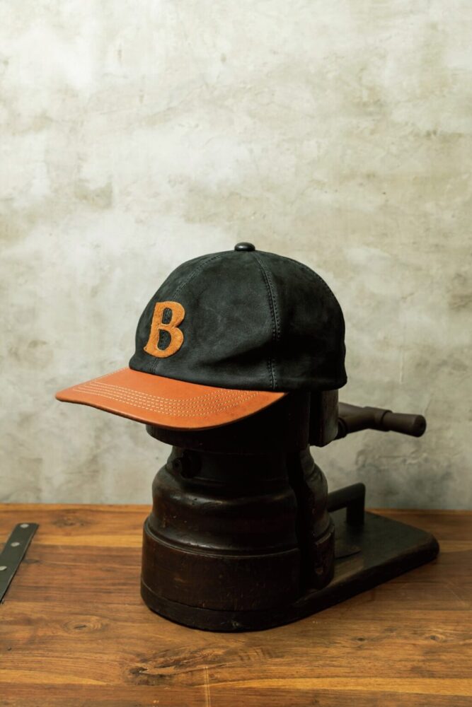 ヌバックのクラウンに無染色ホースハイドのブリム、ディアスエードの“B”ロゴを組み合わせた素材選びが光る。被るほどにヌメ革が飴色に近づくダイナミックなエイジングが味わえる、レザーラバー必見の逸品。3万1900円