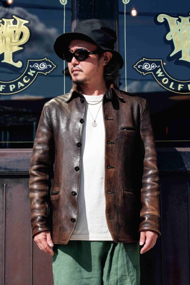 1930年代のカーコートをデザインモチーフに、パターンを徹底的に見直すことでスタイリッシュに現代に甦らせたギルモア。ヴィンテージのような迫力ある質感を再現するため、原皮の段階から厚みのある大判の革を選別し、元々3㎜厚の革を2㎜に割って使用している。齊藤さんの着用しているギルモアを見ていただきたい。全体から茶芯が出現し、あたかもヴィンテージのような色気のあるオーラを放っている。これは、過度な仕上げを行わない、ほぼ“素上げ”の状態なので、こうした自然な茶芯が味わえるのだ。26万4000円