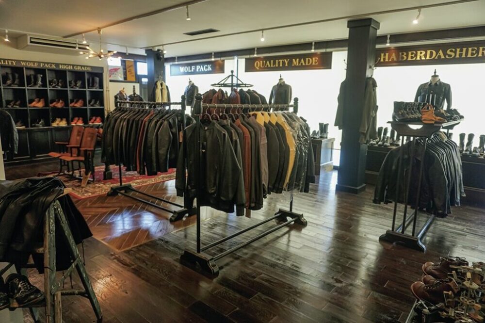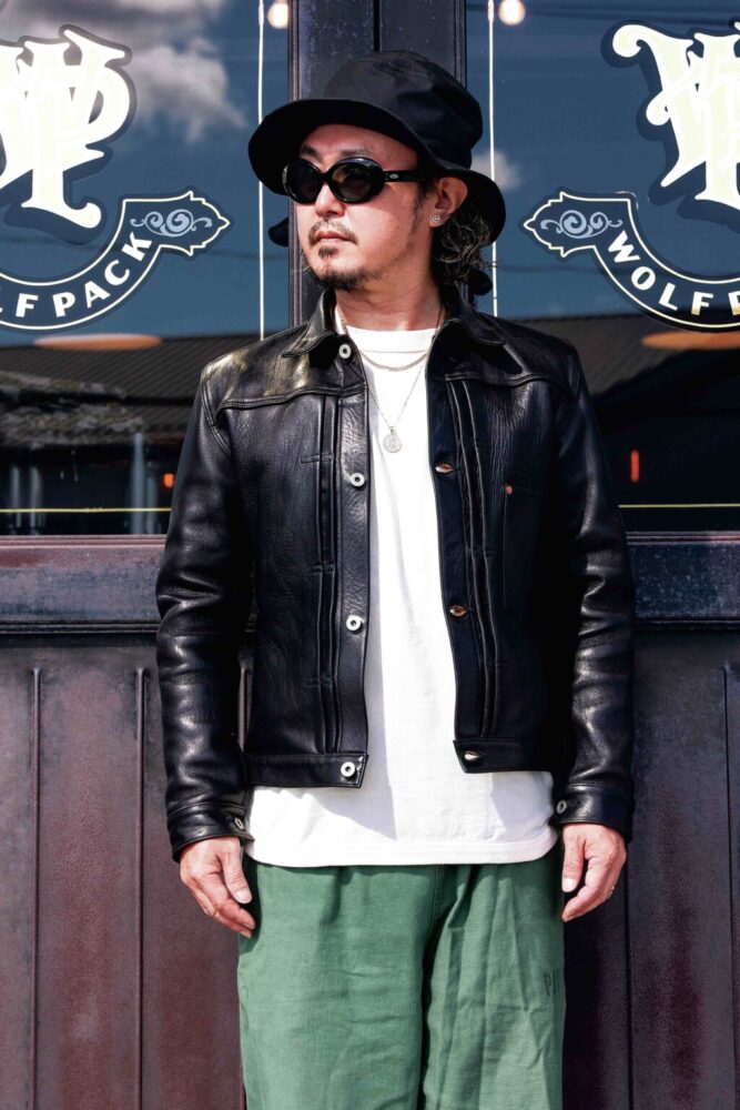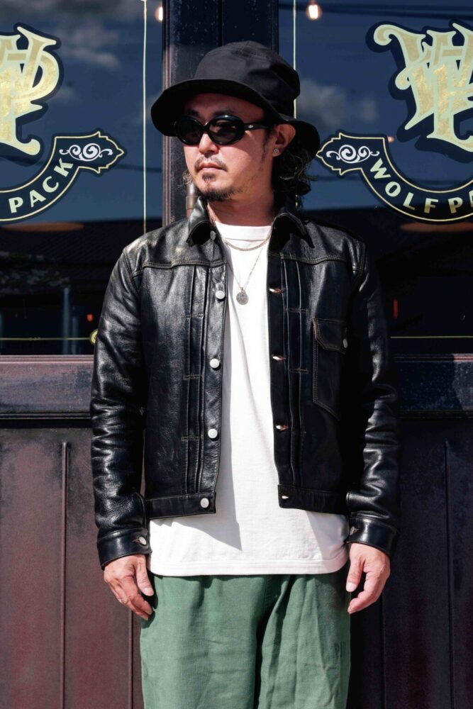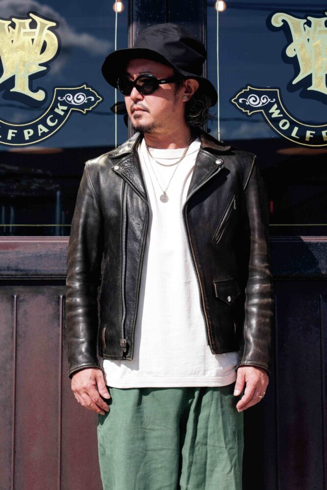 王道のダブルライダースをベースに、1950〜’70年代のディテールをミックスさせ、理想のライダースを作り上げた。このレオン・カスタムは、エポレットとベルトをあえて切ったモデル。1.8㎜厚のフルベジタブルタンニン鞣しのホースハイドを使用し、まず芯通しで茶の水性占領で染め、その後に芯まで染めないように黒の水性染料で丸染めしている。ただ、これだけだと下地の茶が見えてしまい、表面が黒くならないので、さらにもう一度、銀面のみに黒の水性染料を吹き付けている。非常に手の混んだ仕様なのだ。20万6800円