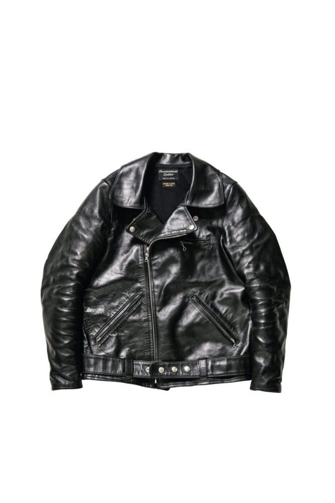 1940年代のライダースジャケットをベースに、ファウンテンヘッドレザーなりの解釈で現代的に甦らせた意欲作。シンプルな意匠ながら、大振りな襟やベルトのスナップボタンなどが個性を主張している。オリジナル特有のゆったりしたシルエットを解消し、アームホールを細くし、若干着丈を長くすることで今っぽいスタイリッシュなフォルムを実現した。革は前ページのXI同様のフルベジタブルタンニン鞣し・アニリン仕上げの馬革を採用しており、エイジングは折り紙付き。ブラック、ブラウン共に着込むほどに茶芯が出現する。21万8900円
