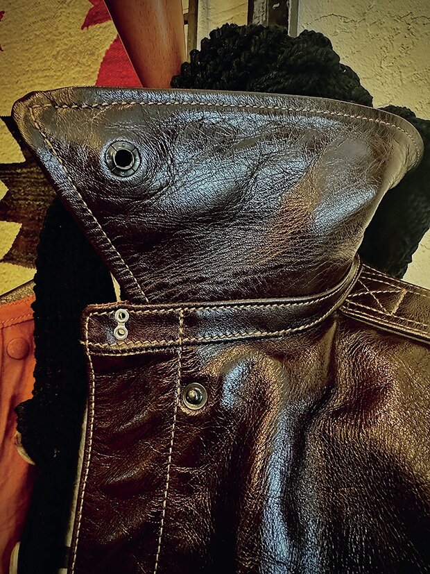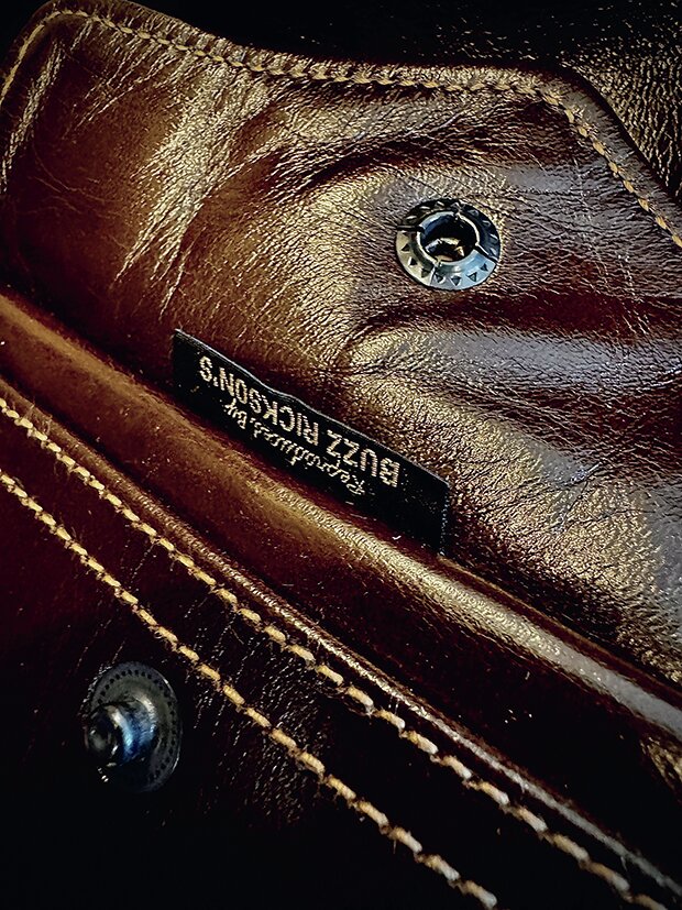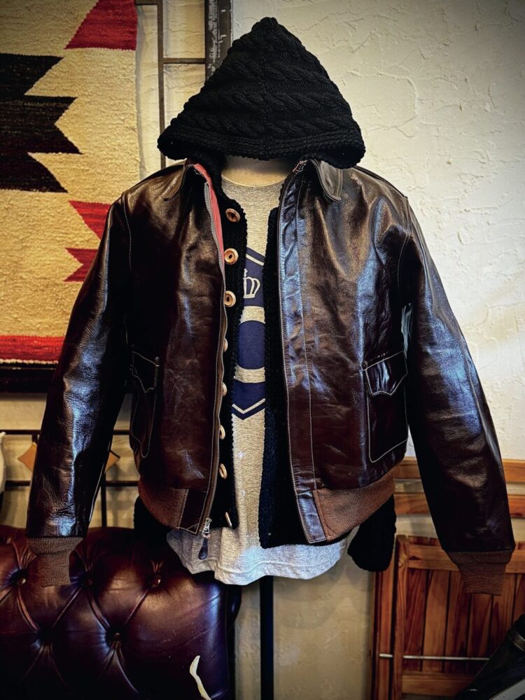バズリクソンズの定番、ラフウエアのA-2。「おいしさ」の秘密は、ハンドアニリン仕上げのホースハイド。深みのあるシールブラウンだ。カタログ掲載は最大サイズ44だが、外国人客の多い新宿のジャンキースペシャルが別注したビッグサイズ46&48。レイヤードも楽しめる。26万4000円(ジャンキースペシャル TEL03-3232-0850 https://jukyspecial.com)