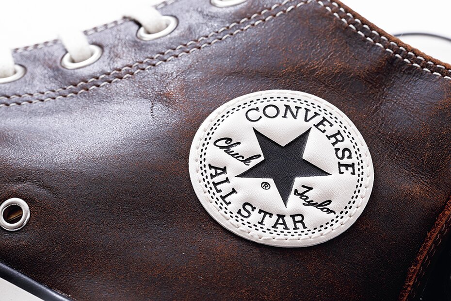 艶出し加工の生成りテープと6㎜幅コットンシューレース、光沢のあるハトメを配したクラシックなディテール。高密度ウレタンとラバースポンジのインソールで快適な履き心地、アッパーにはクラック感のあるオイルレザーを採用。履き込むほどに味わいが増す、素材アレンジモデル。1万9800円(コンバースインフォメーションセンターTEL0120-819-217)