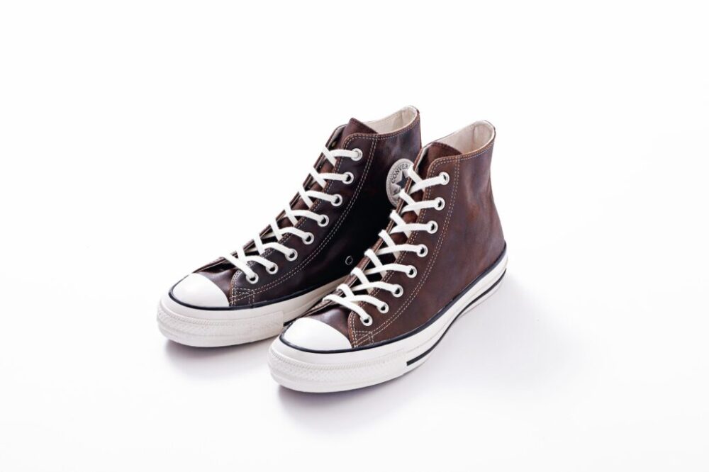 艶出し加工の生成りテープと6㎜幅コットンシューレース、光沢のあるハトメを配したクラシックなディテール。高密度ウレタンとラバースポンジのインソールで快適な履き心地、アッパーにはクラック感のあるオイルレザーを採用。履き込むほどに味わいが増す、素材アレンジモデル。1万9800円(コンバースインフォメーションセンターTEL0120-819-217)