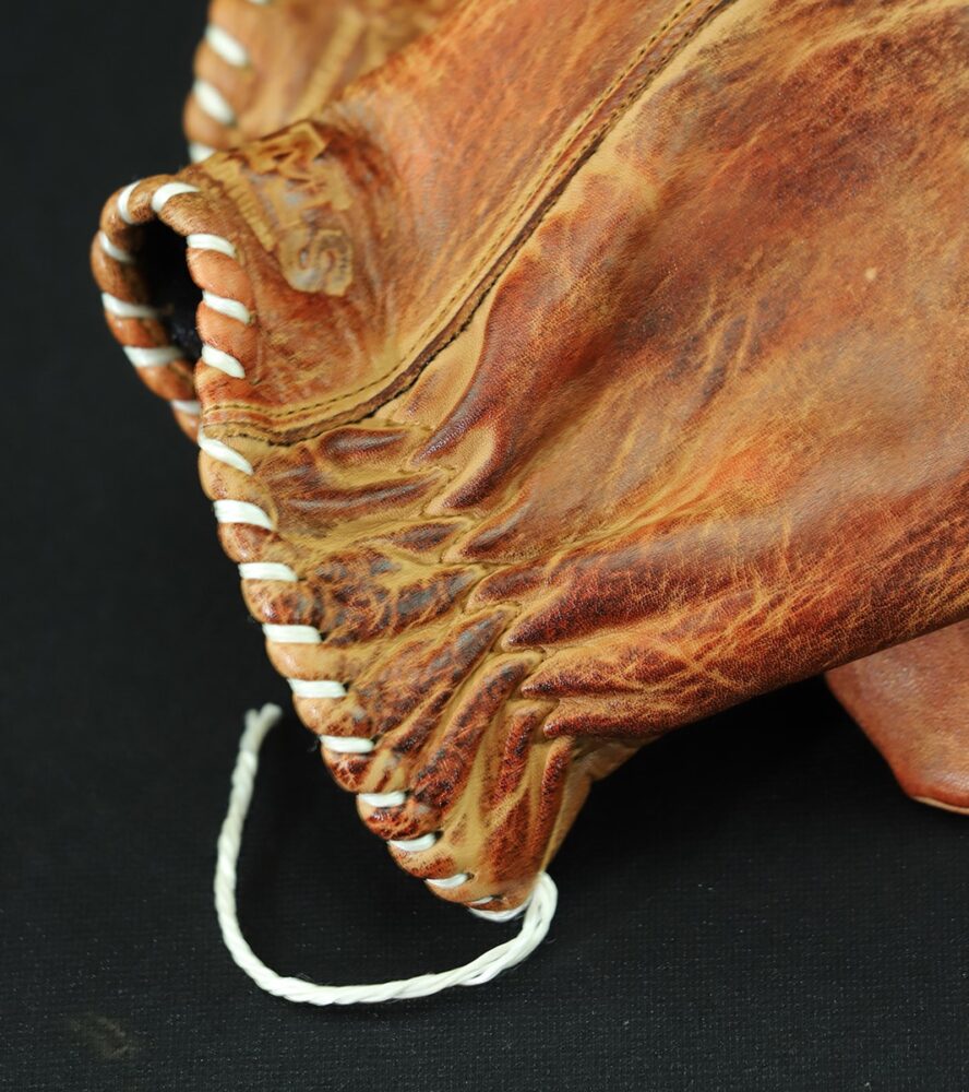 裁断、縫製、ロゴの素押し、リストステッチ、エイジング加工まで、すべての工程を職人が手作業で行っている。そのため大量生産はできないが、丁寧に作り込まれたこだわりのグローブが唯一無二の存在感を放つ。