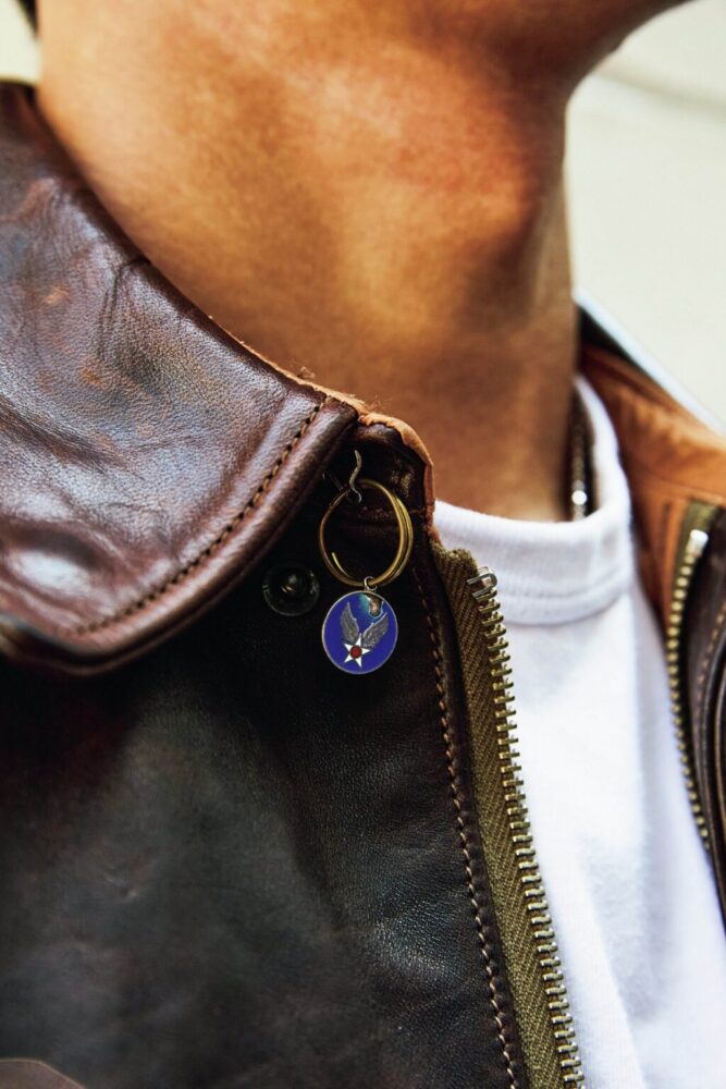 「襟のフックにはアクセサリーやホイッスルなどのアクセントをつけることが、僕の最も大切にしているルールです。今回付けているのは、1940年代頃に作られたUSAAFのネックレスの七宝焼のチャームです。シールブラウンの[A-2]には青など色味のあるものを、浅い色のジャケットにはシルバーなどシックな印象のものを選びます。スタイリング全体から見れば小さな違いかもしれませんが、こうしたこだわりが全体の印象を決めます。