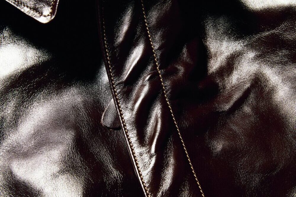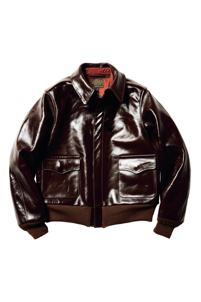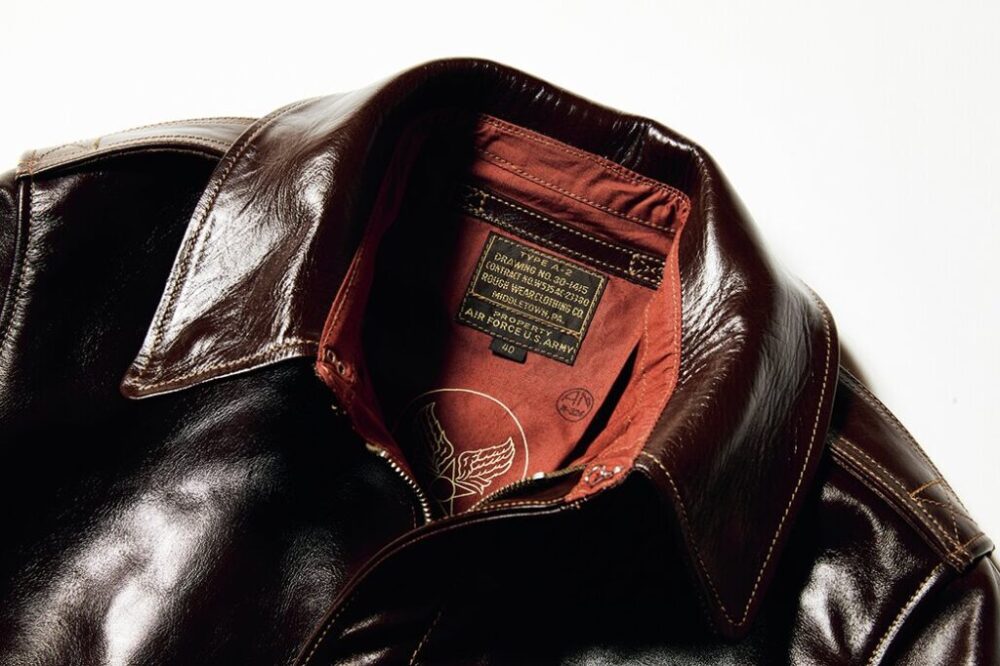 ラフウェア社が1942年に納入した、計5回のうち4番目のモデル。台襟付きの大型襟や2段ラベルが特徴的。イタリア産の原皮をタンニン槽で丹念に鞣し、職人によりシールブラウンのアニリン染料を手作業で擦り込まれ、その工程で生まれる微妙な色むらは個性であり、透明感のある色合いとともに経年変化で豊かな表情を見せる。24万2000円