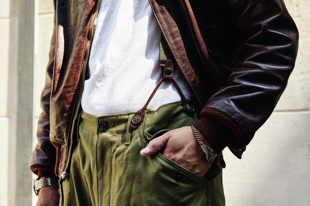 年間で300日以上も穿いているという[M-51]は、佐々木さんが1番好きだというミリタリーパンツ。ベルトではなくサスペンダーで吊り、クラシックに穿きこなす。パンツ3万7400円/バズリクソンズ(東洋エンタープライズTEL03-3632-2321)、その他私物