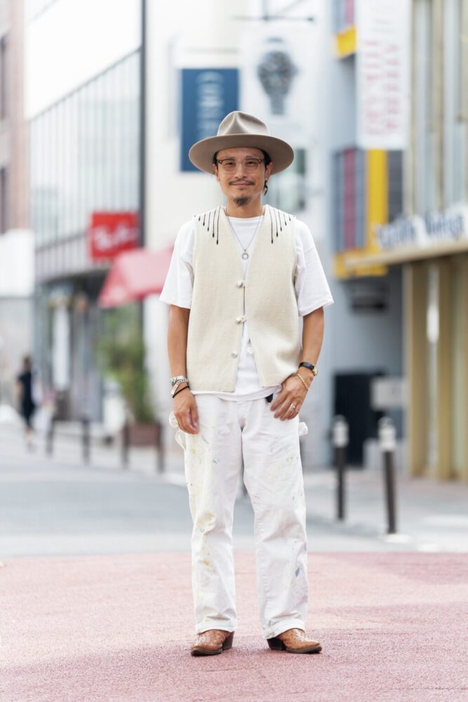 「ウエスタンハットが持つ独特なワイルドさやカジュアル感を活かすために、ネイティブアメリカンのアイテムを合わせるのがマイルール。ともに旧きよきアメリカの象徴であり、カウボーイがコンチョベルトなどのネイティブアメリカンの工芸品を好んでいる歴史が裏付けするように、相性が抜群。それでデニムのセットアップなどにしてしまうとコテコテすぎるので、あえてホワイトに統一して、うまくバランスを取りました」