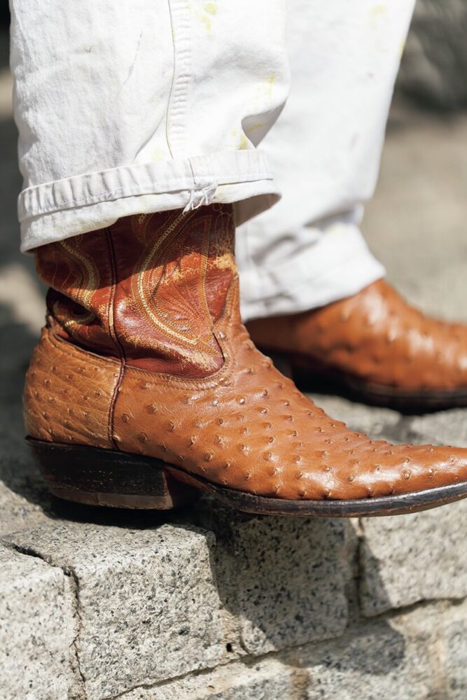 ハットと足元のカラーリングを揃えるだけでグッとこなれた雰囲気が出るのでオススメ。この日はヴィンテージのウエスタンブーツをピックアップ。オーストリッチを贅沢に使っている。